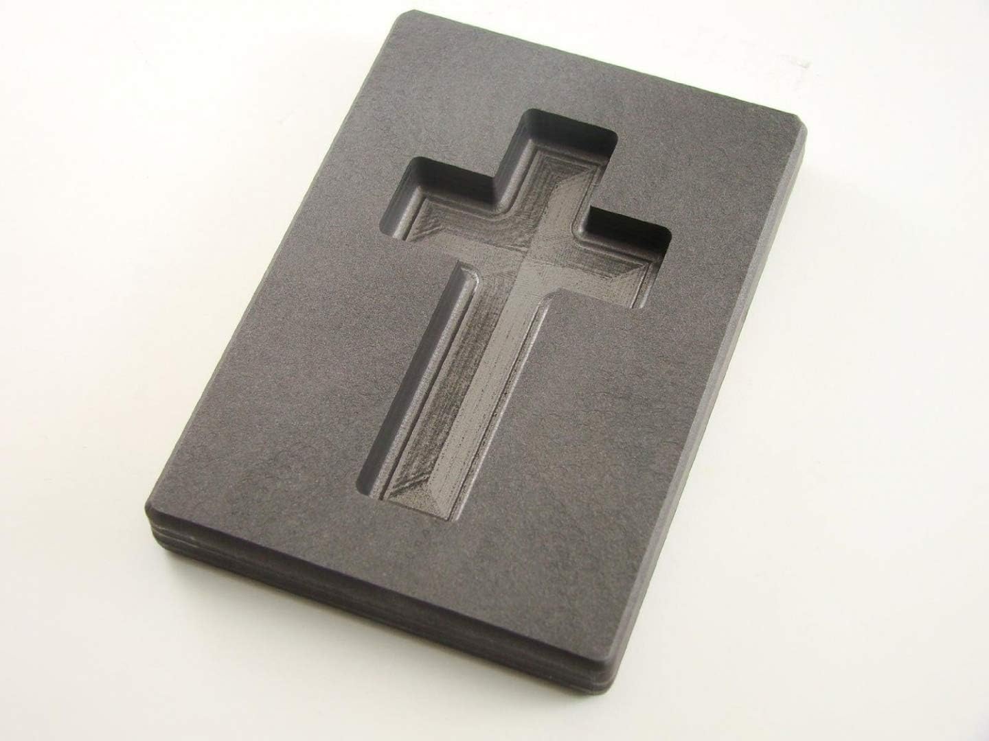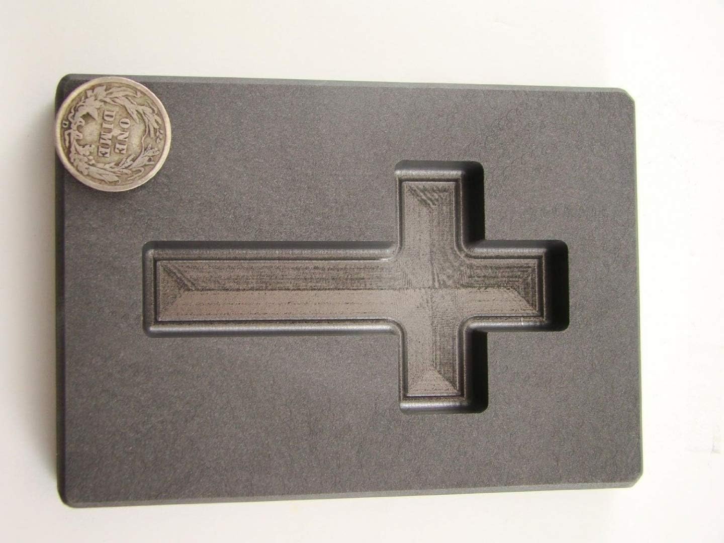Inside size of the mold is 2-3/4" Tall X 1-5/8" wide X 1/4" deep. The cross shaft is 9/16" in width. Machined graphite ingot with a steeper wall taper than our normal molds for better metal removal. This Mold is great for making bars or Necklace Pendant or Charm then customize it. The weight of each bar depends on what metal your working with and how full you fill each cavity. Full to the top plus a bit more will give you a apx 5 Troy ounce Gold Bar. Silver will be like 3 oz. Silver dime shown in the pic is not included.