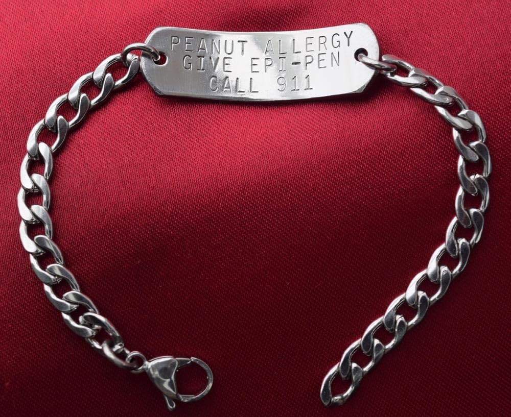 Our I.D. Bracelets have the engraving deep stamped into the tag using an old process and an antique machine. Modern engraving machines barely scratch the writing on to the tag and then it quickly wears off. deep stamping insures that this will never happen and the important information stays on the tag even after really heavy use. The Heavy Duty stainless steel chain and plate are of the highest quality, and the clasp which at first may seem difficult to remove, guarantees that the bracelet will not easily break or get lost. perfect for active people on the go, our bracelets will not rust or tarnish in any environment. Police and Paramedics highly recommend the use of medical alert bracelets as a way to quickly identify emergency medical needs that could SAVE YOUR LIFE.