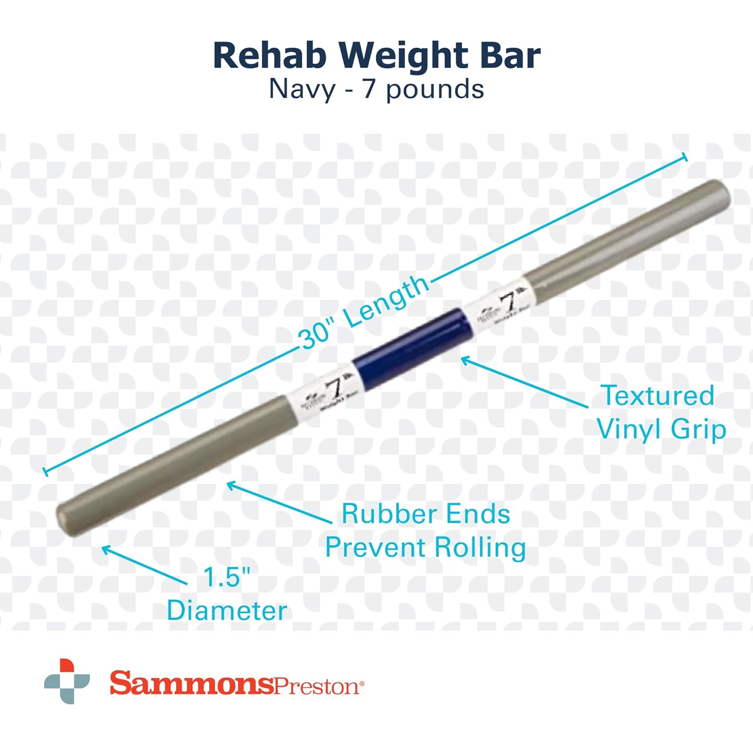 PROGRESSIVE STRENGTH SOLUTIONS FOR EVERY STAGE OF RECOVERY: The Sammons Preston Rehab Weight Bar family is designed to support strength building, motor control, and mobility for people of all ages and ability levels. Whether you're just starting therapy or building endurance after injury, this collection offers flexibility and performance you can trust — at home or in the clinic. A FULL RANGE FOR CUSTOMIZED CARE: Choose the bar that fits your needs — available individually in 1-5 lbs., 7 lb, 8 lb, and 10 lb weights — or opt for the 5-pack set to support progressive training. Each bar features a 30-inch, non-bendable PVC tube with a comfortable vinyl grip and rubber ends to protect floors and prevent rolling. The color-coded system makes it easy to grab the right weight at a glance. TRUSTED IN CLINICAL & HOME SETTINGS: From modified exercises like curls and squats to targeted rehab in seated or supine positions, these bars are built for versatility. Easy to wipe clean and designed for repeated use, they’re ideal for therapists, caregivers, and anyone focused on gentle strength improvement. Whether you're training one-on-one or managing multi-user sessions, this product family adapts to your space, goals, and routine.
